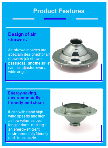 Air shower nozzles are a key component of air shower chambers, primarily designed to effectively remove dust particles adhering to the surfaces of personnel or objects entering the clean area by means of high-velocity clean airflow (air velocity 20–28 m/s) from multiple angles.